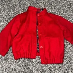 Stylish red button-up jacket with plaid lining. Perfect for a bold look.