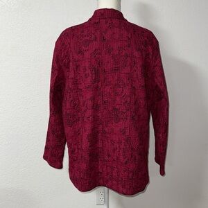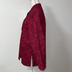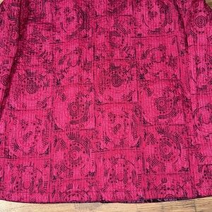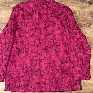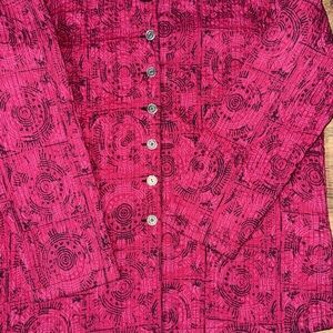 Stylish Pink button-up jacket with a unique pattern. Features black buttons for a classic look.