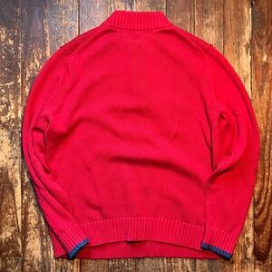 Stay warm and stylish with this vibrant red sweater. Featuring a classic button-up design, it's perfect for any occasion. Kids size large for 14-16 year olds