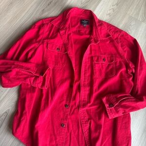 Vibrant red button-up shirt with chest pockets. Perfect for casual wear.