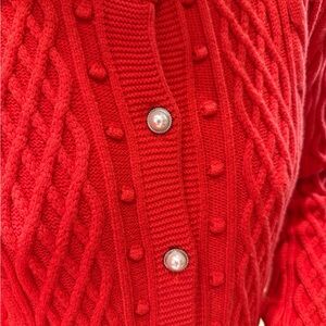 Stay cozy and stylish with this vibrant red cable knit cardigan and shorts set. Perfect for layering, this set offers both comfort and fashion for any casual outing. Pearl button detail is beautiful. Wear the sweater as a duster or a dress!