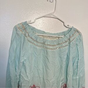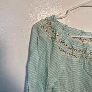 Great condition, new with tags. Red Camel. Off shoulder top. White and teal stripes with teal and pink geometric detail at hem. Crochet detail around neckline. Stripepais provencal. Style 1363177. Size small. 100% rayon. Pit to pit laying flat 19” Shoulder to hem 21” Sleeve (pit to hem) 18”. All measurements are approximate and taken laying flat. Smoke free home. No trades, offers welcome.