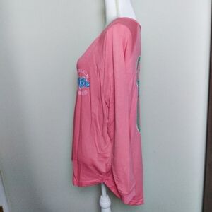 Red Camel oversized long sleeve graphic tee shirt. Slouchy fit with a high-low hem. Front features a heart graphic that says "Southern girls are sisters & friends for life." Back features a large graphic that reads "Southern sisterhood: sun shinin', sweet tea sippin', shoe shoppin' good times." Excellent pre-owned condition: no holes, rips, tears or stains.