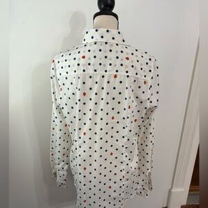 Casual button-down shirt with playful blue polka dots and lady bugs . Features a classic collar and front pockets.