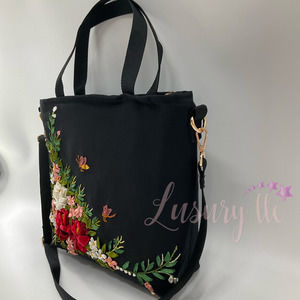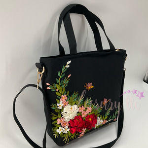 Red Camellia Embroidery Convertible Tote Crossbody Bag, Matching Silk Mask