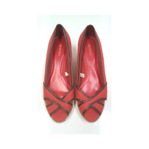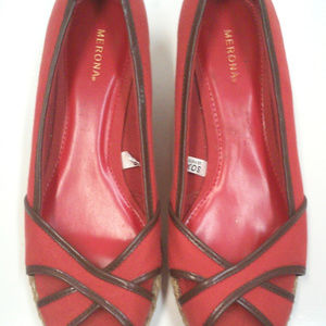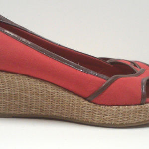 Red canvas peep toe espadrille wedges with brown trim and rope covered wedge heels are a summer classic that will never go out of style. Wear these comfortable wedge style heels with jeans, shorts or dresses for a perfect pop of color. Merona, Size 9.5. No damage, worn once briefly-too large. Run true to size.