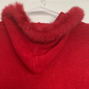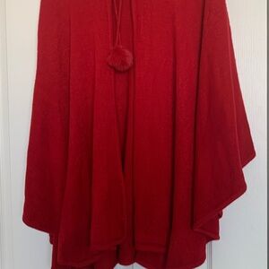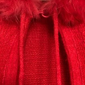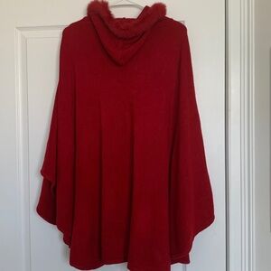 Red Cape with faux fur around hood and tassels. One size. Made of acrylic. Hook and eye closure. Excellent condition. Never worn (see photos)