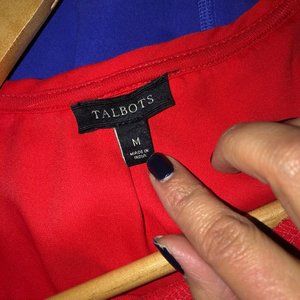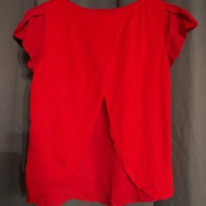 Bright red-orange cap-sleeved blouse. Back has two layers. Interior layer is a chiffon-like material.