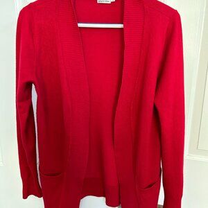 Lightly worn cardigan in striking red. Size M, but it fits closer to a large or somewhere in between medium and large. Smoke free house. In very good condition.