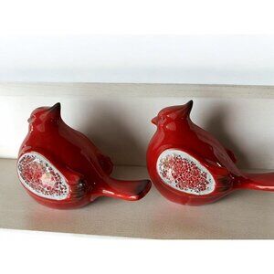 Charming red cardinal ceramic figurines featuring intricate mosaic designs. Ideal for home decor, shelf displays, or as a thoughtful gift.