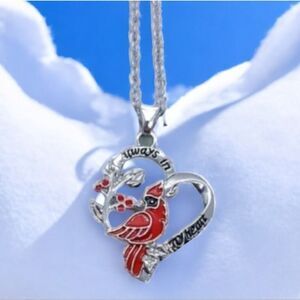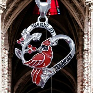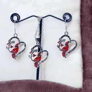 Red Cardinal Bird Silver Heart Necklace + Earrings 3-pc Memory Pendant Jewelry