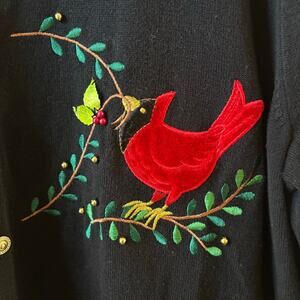 Soft black knit with red cardinals, green vines, and button-up front. Perfect cozy layering piece for fall or winter — gives total vintage / cottagecore vibes 🌿