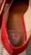 A pair of red and black pointed toe snakeskin pattern pumps, has regular styling, closed back detail