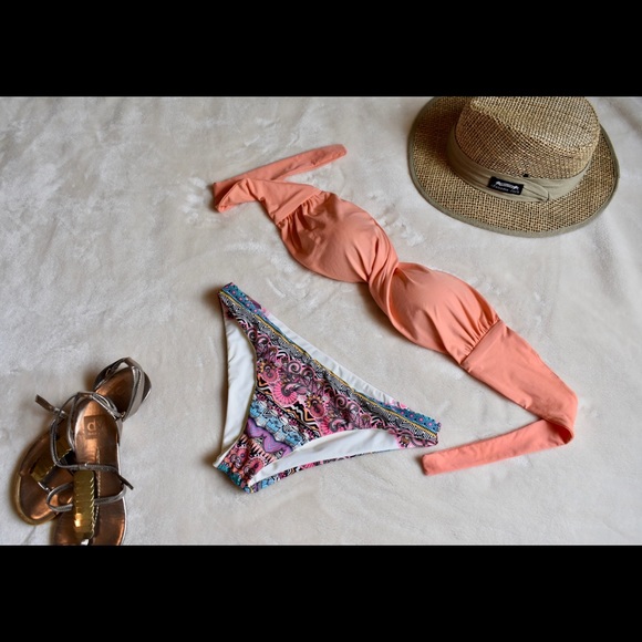 Lined bandeau top and reversible bottoms. Excellent used condition. No stains. Size medium. Matches beautifully with the soft peach colored sarong I have listed.