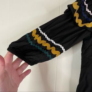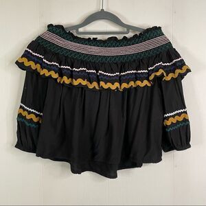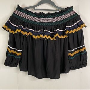 This cute top is in excellent pre-owned condition. It is a crop top and it has pretty ric rac ribbon and embroidered details. The sleeves are elbow length. It’s the perfect sassy top for summer!