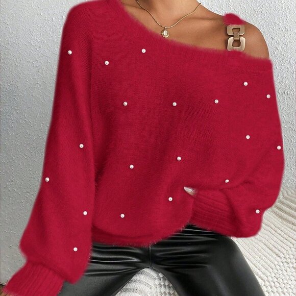 Red Casual Women's Asymmetrical Neck Pearl Decor Long Sleeve Pullover Sweater
