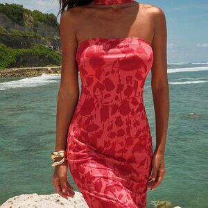 Red Casual Women's Beach Fairycore Wedding Party Elegant Knitted Mesh Print Form