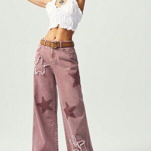 Red Casual Women's Boho Woven Five-Pointed Star Pattern Washed Wide Leg Pants