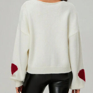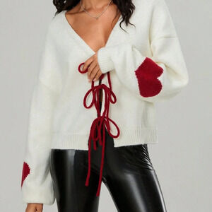 Red Casual Women's Cardigan Heart Pattern Tie-Up Front Long Sleeve Knit Sweater