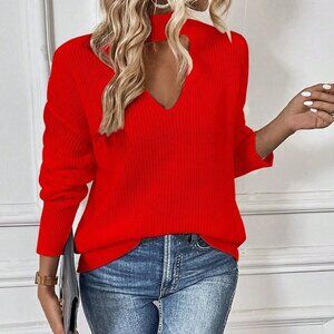 Red Casual Women's Choker Neck Drop Shoulder Sweater