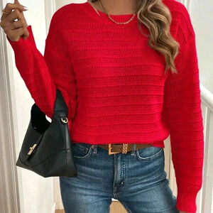 Red Casual Women's Elegant Bowknot Decor Drop Shoulder Sweater