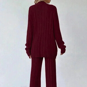 Red Casual Women's Loose Front Button Cardigan And Pants Knitwear Set