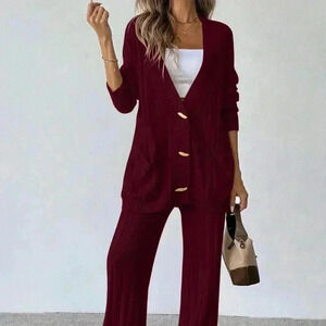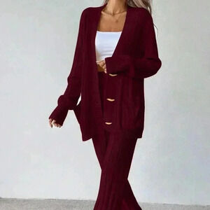 Red Casual Women's Loose Front Button Cardigan And Pants Knitwear Set