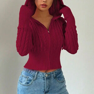 Red Casual Women's Plain Zippered Hooded Drawstring Cardigan