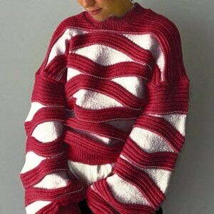Red Casual Women's Round Neck Wavy Striped Color Block Long Sleeved Knit Sweater