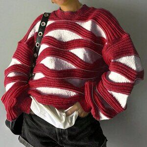 Red Casual Women's Round Neck Wavy Striped Color Block Long Sleeved Knit Sweater