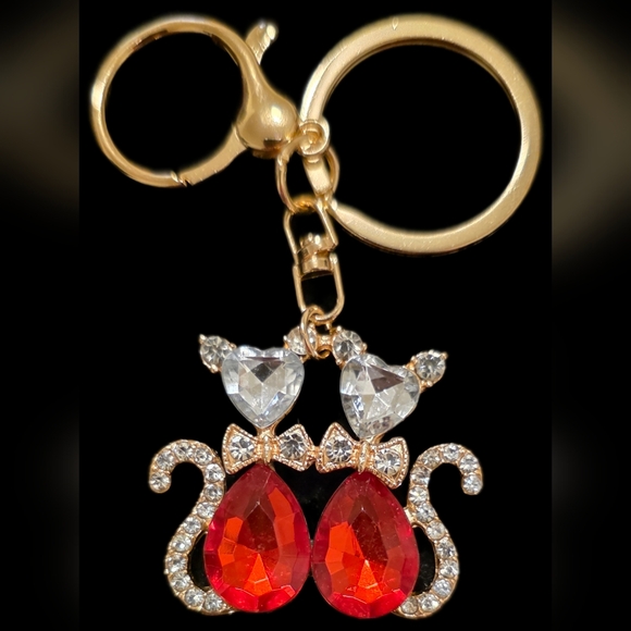 Elegant goldtone keychain featuring red and clear crystal cat design. Perfect accessory for bags or keys.