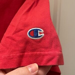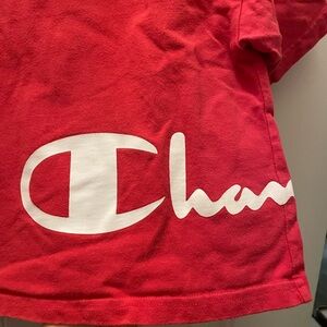 Champion red crop top with Champion printed on side & embroidered logo on sleeve. Size M but could fit a S or a L. In good condition, no visible flaws.