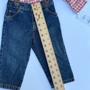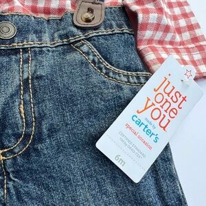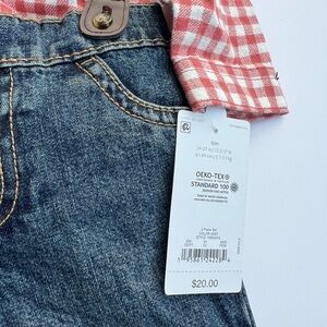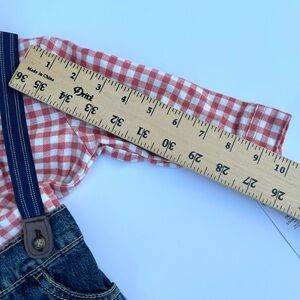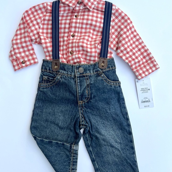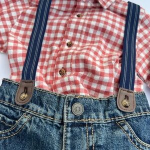 Stylish red checkered long sleeves bodysuits for kids featuring classic button-up design and navy suspenders. Perfect for any occasion. See Pictures. New with tag. All sale are final.
