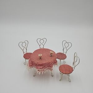 Charming miniature table set with red checkered pattern. Includes table and four chairs.