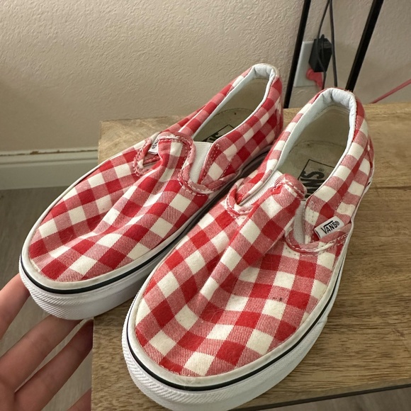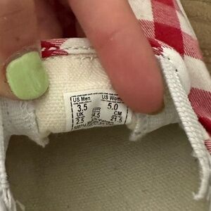 Red and off-white checkered vans, clothe material. Size 3.5y. Will clean if bought.