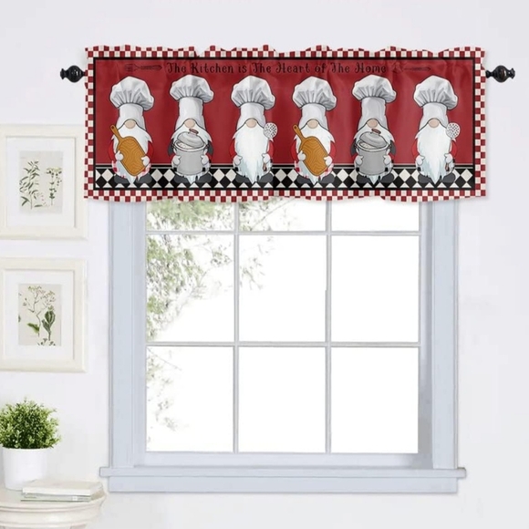 Add charm to your kitchen with this delightful red valance featuring whimsical gnome fat chef designs. Perfect for adding a touch of fun and color to your home decor.