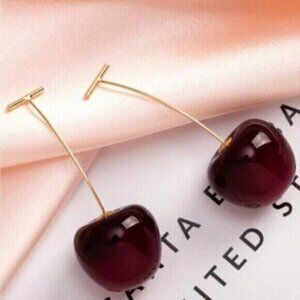 Red Cherry Design Long Gold Stem Statement Earrings