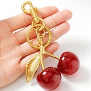 Stylish red cherry keychain with gold accents. Perfect for adding a playful touch to your keys.