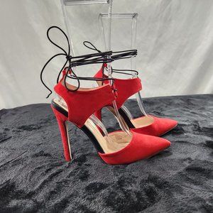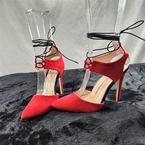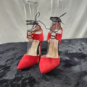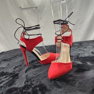 Red Cherry Red With Black Elastic Wrap Sandals With 4 1/2" Stiletto Heels