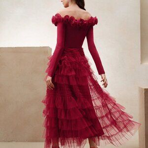 Elevate your party style with this red 3D floral long sleeve V neck bodycon dress, designed for a slim fit and featuring a flattering A-line silhouette. Perfect for making a statement at any party, this long-length dress combines a vibrant red hue with a trendy 3D floral pattern and a chic V neckline.