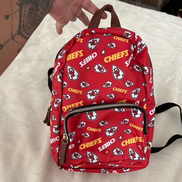Stylish red backpack featuring a bold Chiefs pattern. Perfect for fans on the go.