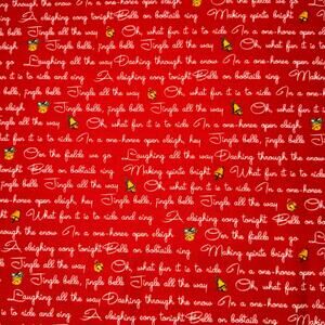 Red Christmas Jingle Bells Lyrics by Lindsay Wilkes - Riley Blake Designs - Pattern #C14832 - Red background with lyrics to Jingle Bells in cursive white font and gold color (not metallic) bells mixed in print.