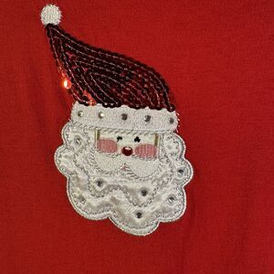 Festive red long sleeve holiday top featuring an adorable Santa face with sequin and bead detailing on the hat and beard. Perfect for Christmas parties or cozy holiday wear.