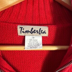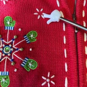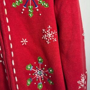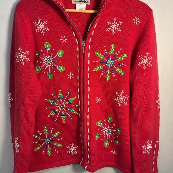 Beautiful Timberlea holiday cardigan sweater in a festive red knit with zip-front closure. Features intricate embroidered and beaded snowflake designs throughout with charming hand-stitched details. Cozy ribbed collar and cuffs. A fun, statement holiday piece perfect for Christmas or winter wear.
