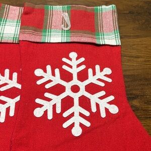Festive red Christmas stockings featuring a white snowflake design and plaid trim. Perfect for holiday decor.