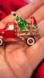 Eye-catching red Christmas truck brooch featuring a green enamel tree and gnome on the back. This piece is a larger statement size with bold color and beautiful shine. Perfect for holiday outfits, coat lapels, and gifting.