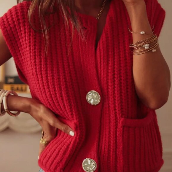 Ivory Chunk Knit Sweater Vest in Red with Gold Buttons and Knit Pockets.