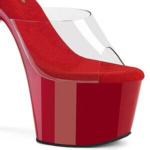 Unleash your inner confidence with these striking red and clear platform mules. Designed for maximum impact, they feature a dramatic 7-inch stiletto heel and a sturdy 2 ¾-inch platform, ensuring both stunning height and comfortable support. The vibrant red base perfectly complements the transparent upper, creating a captivating visual. Ideal for exotic dance shoes, pole dance heels, or any occasion demanding a bold statement, these red platform heels and clear mule sandals are crafted for unforgettable style and performance. Elevate your footwear collection with these essential high heel mules for women.
