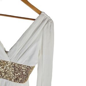 Glittering gold sequins adorn this snow white chiffon dress. Beautifully tailored, this dress features a v-neck front and back, long flowing sleeves, a nipped sequin banded waist, and a sweet chiffon skirt. Button cuff details. Fully lined with a zipper back closure. The sweetest party dress for the season.