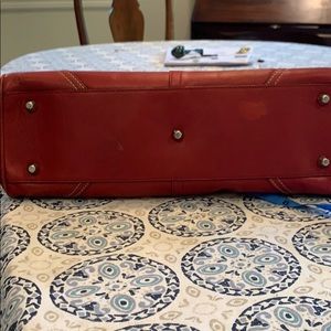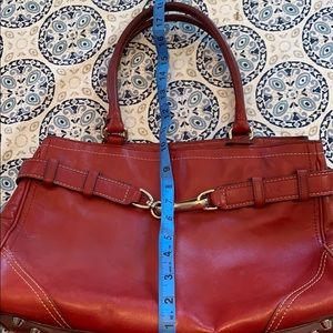 Red coach bag… There are worn parts on the bottom and sides of the bag the handles are slightly darker than the rest of the bag because of use.